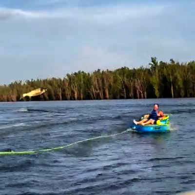 A man rides a tube pulled by a boat in a lake. A fish jumps out of the water and into the tube. He leans over to get away from it and falls out of the raft.