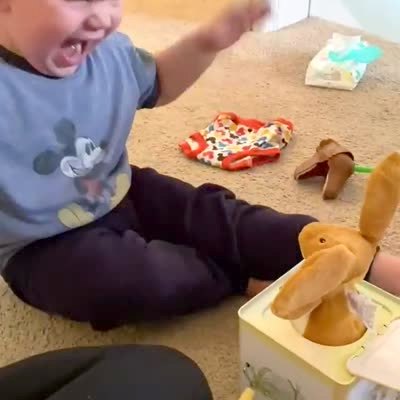 A young boy turns the crank of a Jack in the Box. The toy jumps out and the boy screams.