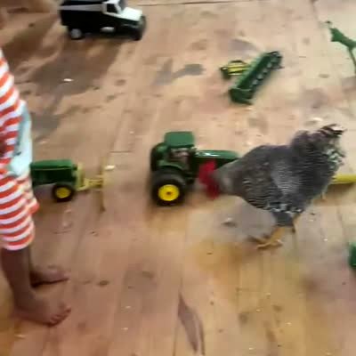 A young boy tells a rooster to get out of a barn and the bird jumps up and kicks him in the face.