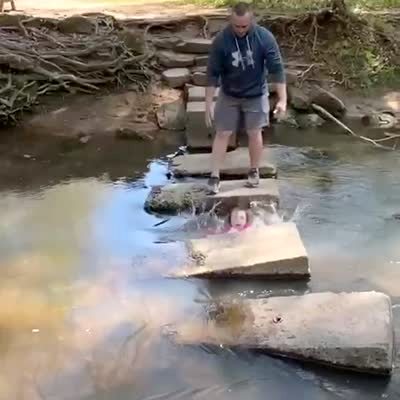 A man and young girl walk across a stream. The girl jumps and falls between the steps into the water and the man pulls her out.