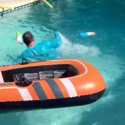 As a young man jumps out of a boat into the water, he accidentally smacks his head against the camera in his hand. No appearance release for the black man in blue shorts.