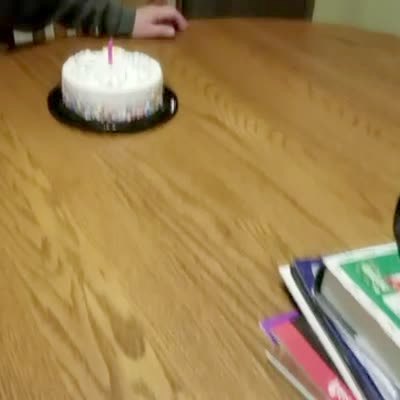 A grandmother sits at a dinner table and a teen boy and his mom sing her "happy birthday". The older woman blows out the candle on her cake but a dog jumps up next to her and starts to eat it but she laughs and pushes him away.