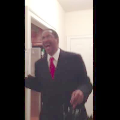 A girl jumps out of a closet to scare her father and he has a crazy reaction.