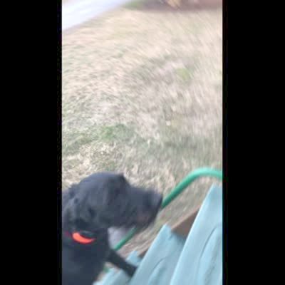 A black dog struggles to run up a slide and climb up jungle gym steps.