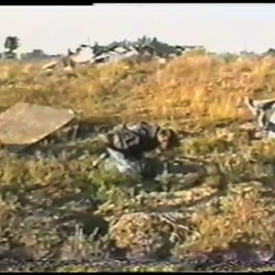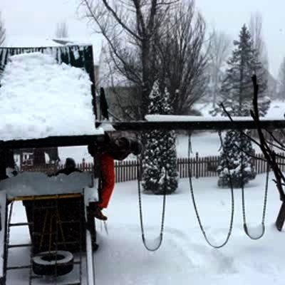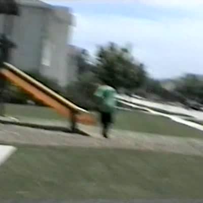 A man pushes a woman on a swing-set in a yard, as a young girl screams when the swing-set stars to shake and wobble. The woman then pushes the man over with her feet which sends him in the air and down to the yard, knocking over the camera. Video rotates sideways. (:52)