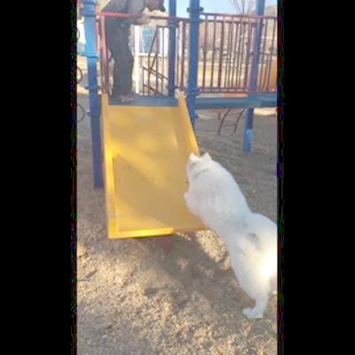 A young boy and a dog slide down a slide at a playground in slow motion. The dog is wide-eyed and jumps off at the end.
