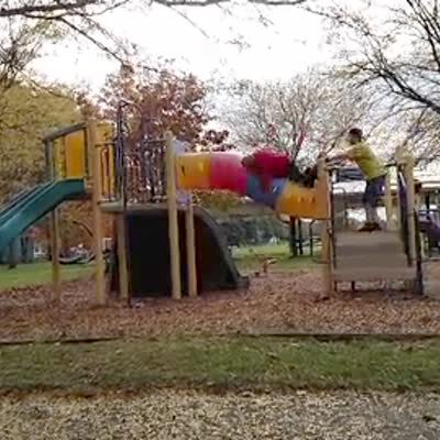 A young boy runs and flips on a jungle gym bar. A dog runs under the young boy and the boy lands on him and is dragged by the dog. Slow motion.