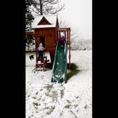 A teenager boy gets stuck on a jungle gym in a snowstorm outdoors.