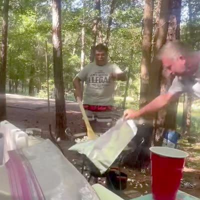 A man moves corns kernels on the fire and pops popcorn while people laugh outdoors.