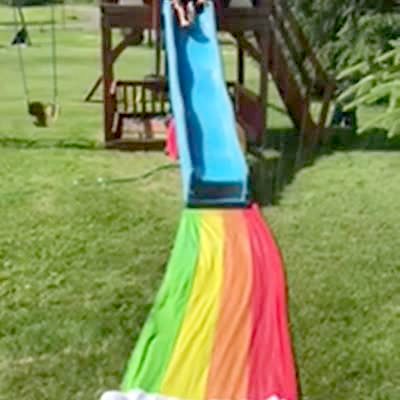 A young girl attempts to climb up a slide in the backyard with a rope. She falls off.