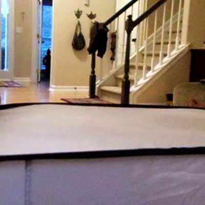 A dog is put in its collapsible kennel as a family goes to leave. The dog flips the kennel over and over so it can follow them as they walk away indoors.