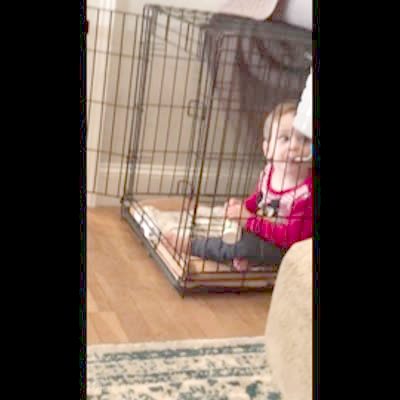 A tot boy sits in a pet kennel crate in the living room while he drinks out of the water dispenser tied to it.