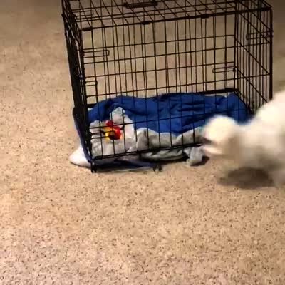 A dog runs away from a man and lies down in a kennel crate whenever he asks if she wants to take a bath.