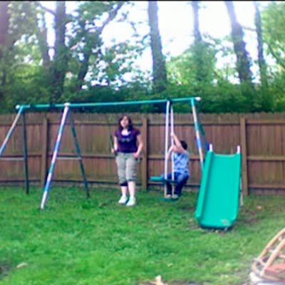 Teen girl tries to swing in kiddie swing in backyard playground, swing breaks and sends her flying into yard.