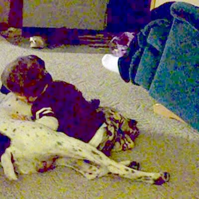 "Doggy Dance Off" Tot boy break dances on the floor of the living room, a small dog in a sweater comes over and rolls around on the floor next to him. Family laughs.