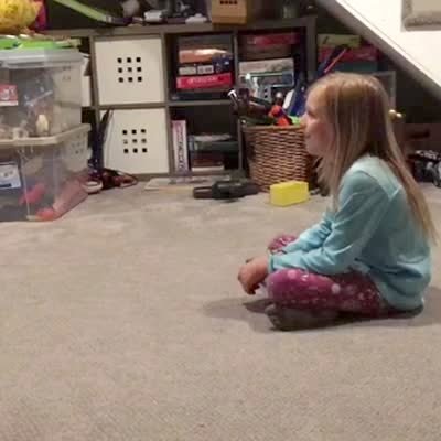 A young girl recites the pledge of allegiance in the living room. She says "squirrel" at the end.