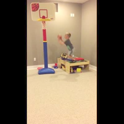 A tot boy runs and jumps off a table to make a slam drunk on a toy basketball hoop, but then the hoop falls on his head indoors.