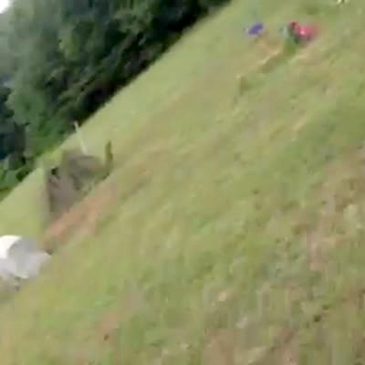 Boy snow sledding, wipes out. Looks up, and another sledder runs over his head. Looks like decapitation.