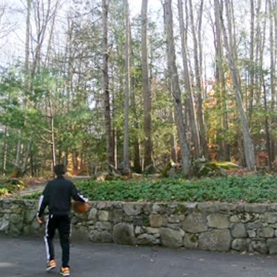 A boy throws a basketball backwards over his head outdoors and into a basketball hoop. Trick shot.