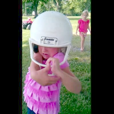 A little girl cries for her mom after getting her head and arms stuck in the face mask bars of a football helmet.