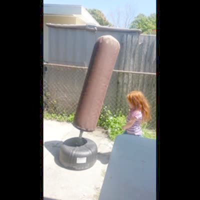 A young girl hits a wiffleball that hits her father in the head while he sits in a lawn chair in the yard. It ricochets off his head and flies offscreen.