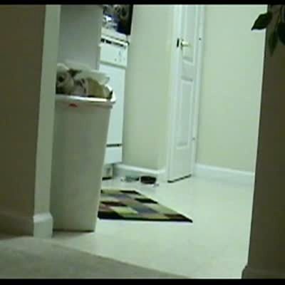 Chihuahua tries multiple times to climb into a trash can to get chicken that has been thrown out. Dog falls out of the can. Kitchen. Graphics over clip.
