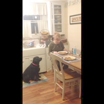 A dog watches a woman eat a plate of food in a kitchen and every time she looks at the dog, the dog looks away. AA: Dogs pretending not to stare at your lunch.