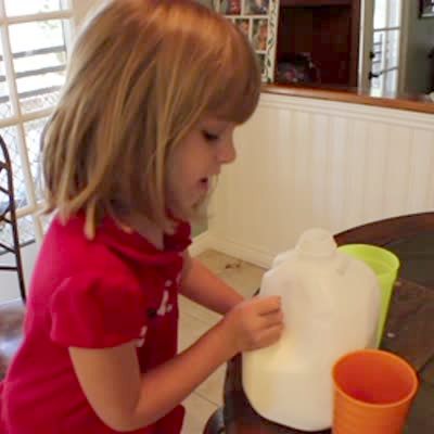 A young girl spills milk all over the table while trying to pour herself a glass for the first time. Parents keep saying they know it's not going to go well as they watch her do it. Kitchen