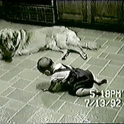 Golden Retriever dog watches baby crawling in kitchen, stand up, walks over to baby and sits on baby's head. Baby's cries are muffled under dog's butt.
