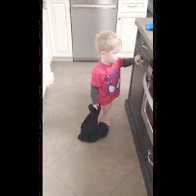 A tot boy removes his pants and throws them into the kitchen trash but misses and finds the pants on the floor after he closes the drawer. He tries and fails again, and on the third time, he gets them in and says "Yay!"