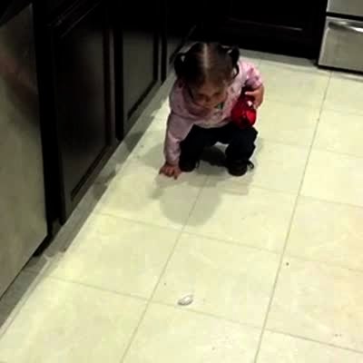 A girl tot tries to pick up ice to put it in a cup in a kitchen. Every time she bends over to pick up ice, more ice falls out of the cup. Cute.