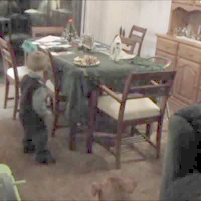 A little boy tot drops a plate of cookies on the floor two times carrying them to the chimney for Santa and then spills milk eggnog in the kitchen several times. Action at :21, 3:55, 5:58, 7:10