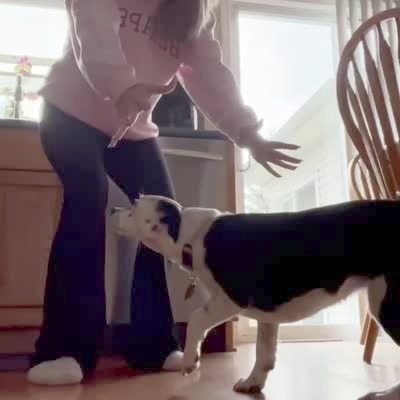 Jack Russell terrier dog chases laser pointer in the kitchen, boy points the laser pen at dad's butt. Dog jumps up and bites man's butt several times.