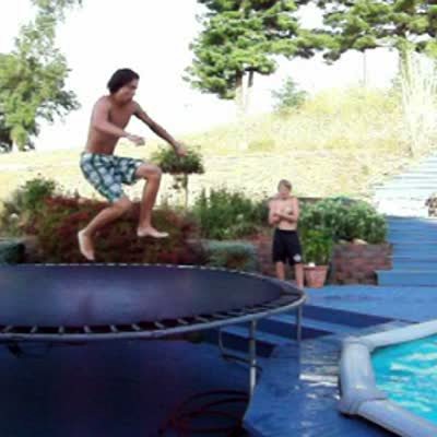 Teen boy tries to dive from trampoline into pool, the trampoline rips his leg gets stuck in it, he falls into the pool head first narrowly misses hitting his knee.