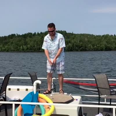 A man tries to drive his golf ball off a boat and then ends up hitting himself in the knee.
