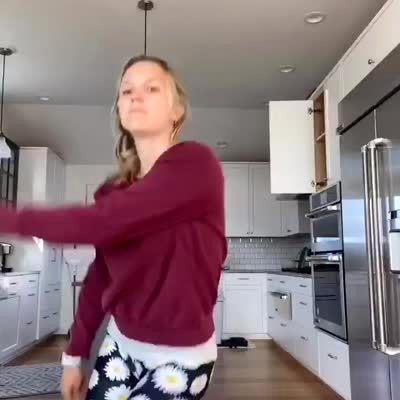 A woman dances to a tiktok in the kitchen, and hits her tot girl in the face with her knee.