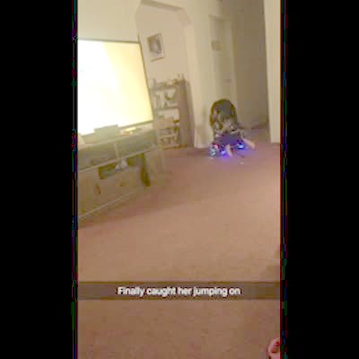 A young girl kneels on a hoverboard and rides it in a house. A puppy dog climbs on to her back in a living room and rides with her. Snapchat video.