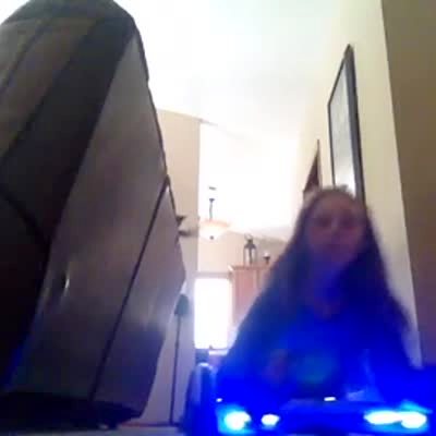A young girl kneels on a hoverboard as she rides in and a kitten cat jumps off of a couch and on to the girl's back.