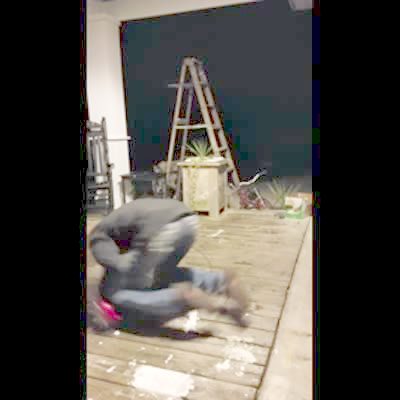 A woman dances on a massage table in the kitchen and it collapses and she falls off.