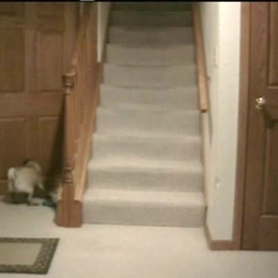 A woman walks out of the front door. The door catches on her hair and her wig flies off. Security footage.