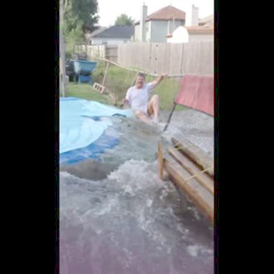 A man slices holes into an above ground pool and on the third slice, the pool bursts open and the water flow knocks the man down and floods his back yard.