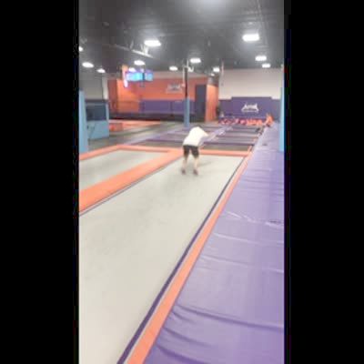 A man does a series of back flips on a trampoline in a trampoline park and crashes into a young boy and knocks him down.