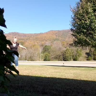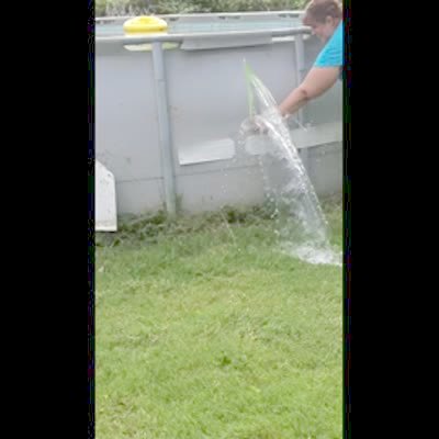 A woman uses a knife to cut the wall of an above ground pool in the yard to drain water out of it. The wall breaks open and she gets knocked down as water floods out.