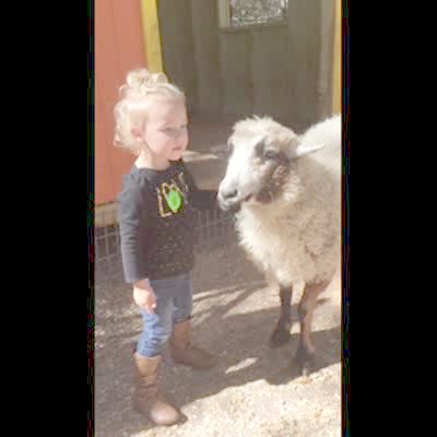 A goat stands on a man's back while the man pets other goats on a farm. A sheep runs over and knocks a woman down.
