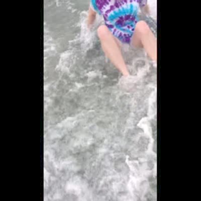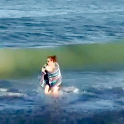 A wave knocks a woman and her teen son down while they stand in the ocean.