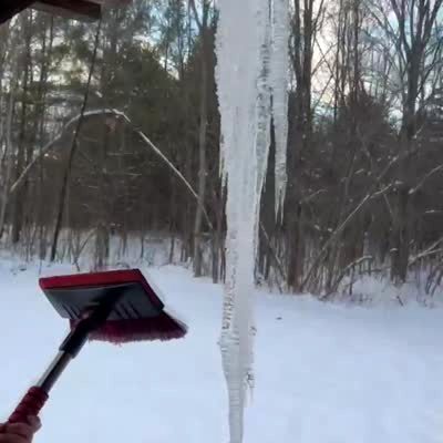 A young boy puts on an act while he knocks down a large icicle and breaks the whole drain off.