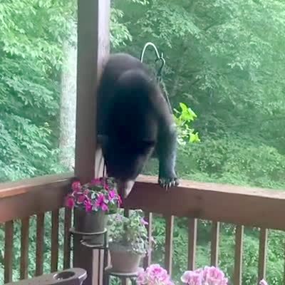 A black bear licks the rail then knocks over items and climbs down the banister on the front porch.