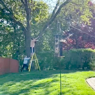 A man cuts a limb off a tree in a yard and the tree limb falls down and knocks the ladder from underneath his feet and he falls down.