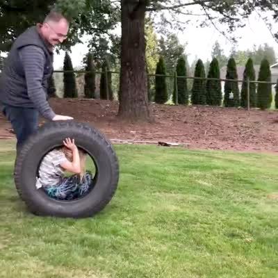 A young girl sits inside a tire in a yard and a man rolls her down the hill and another young girl tries to catch the tire and it knocks her down.
