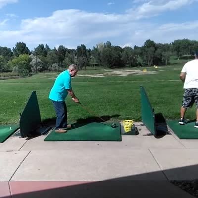 A senior man hits golf balls on a driving range but falls over and knocks down the barrier. Featured talent cleared only (the golfer who falls over and the woman who runs over to help him).